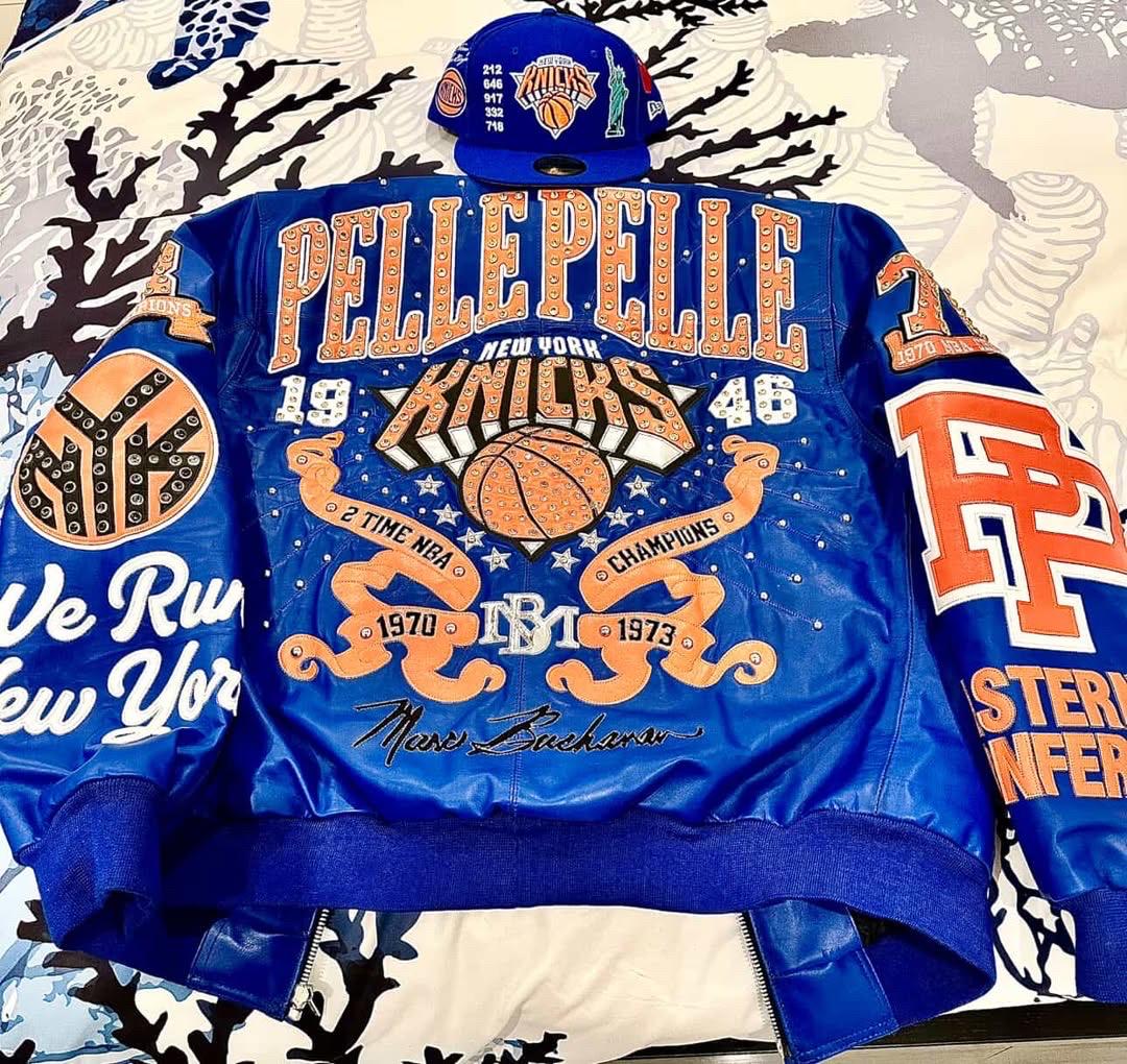 Hand-placed stud detailing on “Pelle Pelle” and “Knicks” lettering.