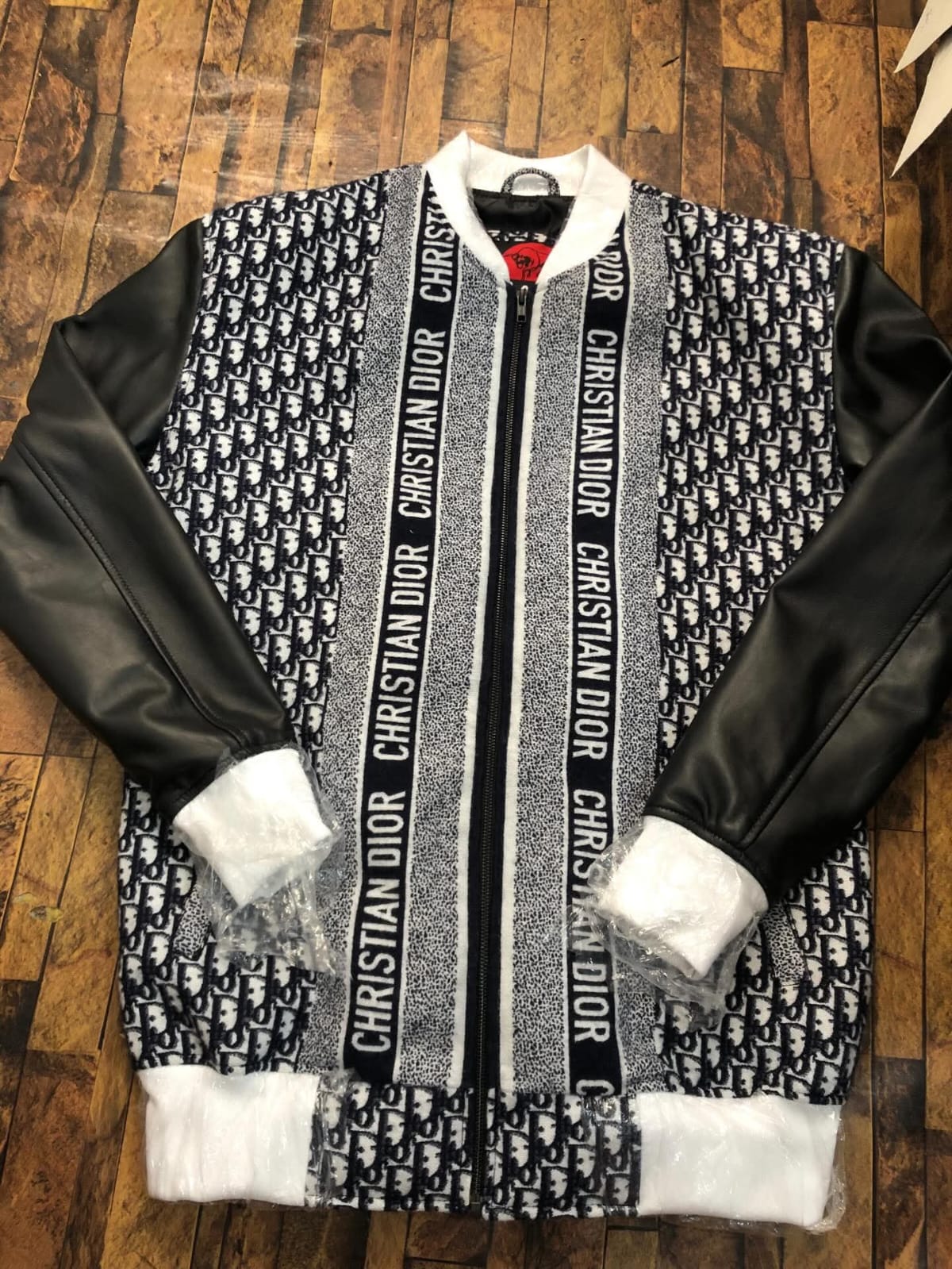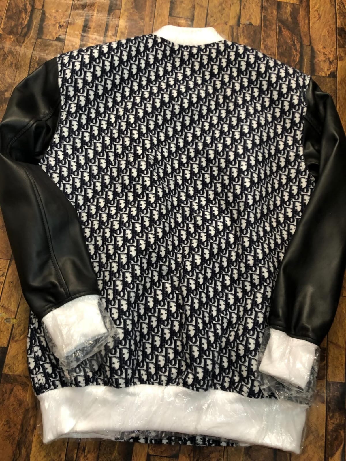 Premium Custom Leather Jacket featuring black leather sleeves and a white-and-navy monogram oblique textile body with ‘Christian Dior’ vertical branding strips and ribbed white trim.